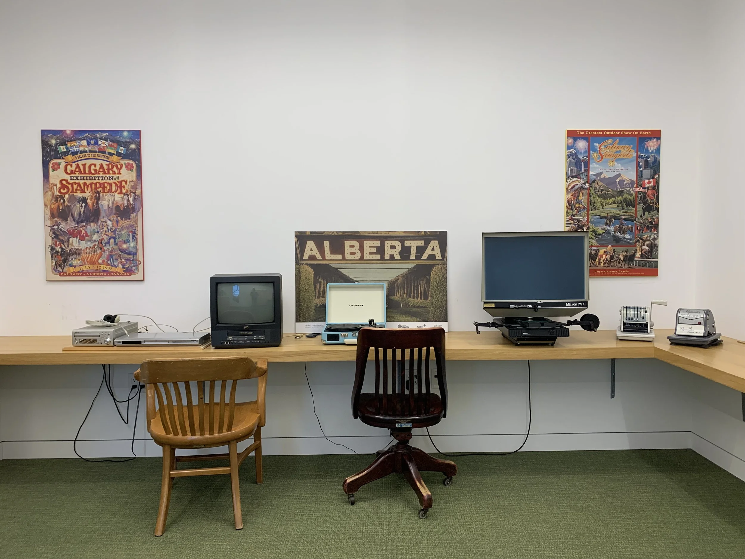 Calgary’s Story also includes the Vintage Media Lab, which can be used by patrons to watch movies from the Library’s collection on VHS and DVD, or listen to CDs and vinyl records.