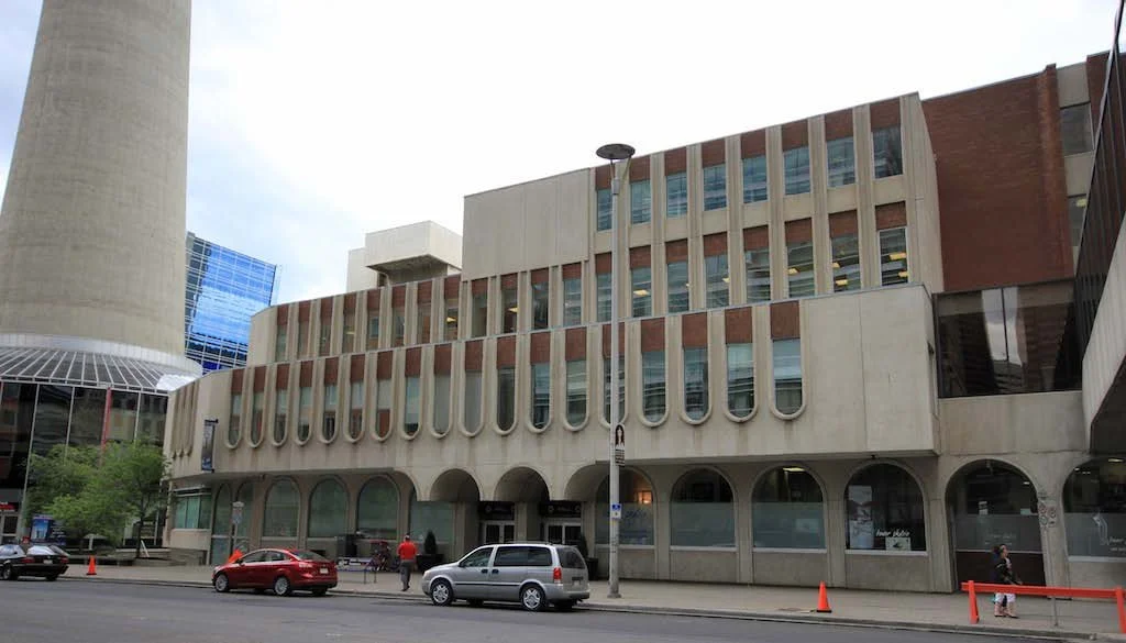 The former Calgary Public Library, now the Calgary Police Service Processing Centre, was used as the exterior former FEDRA detention cell/yard.