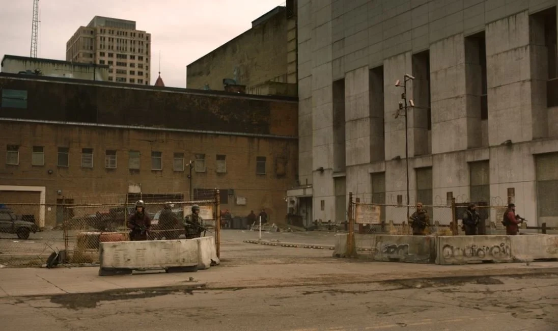 View of the alleyway featuring the Customs House (centre) and the lower Louise Block to the far left. The Last of Us, HBO.
