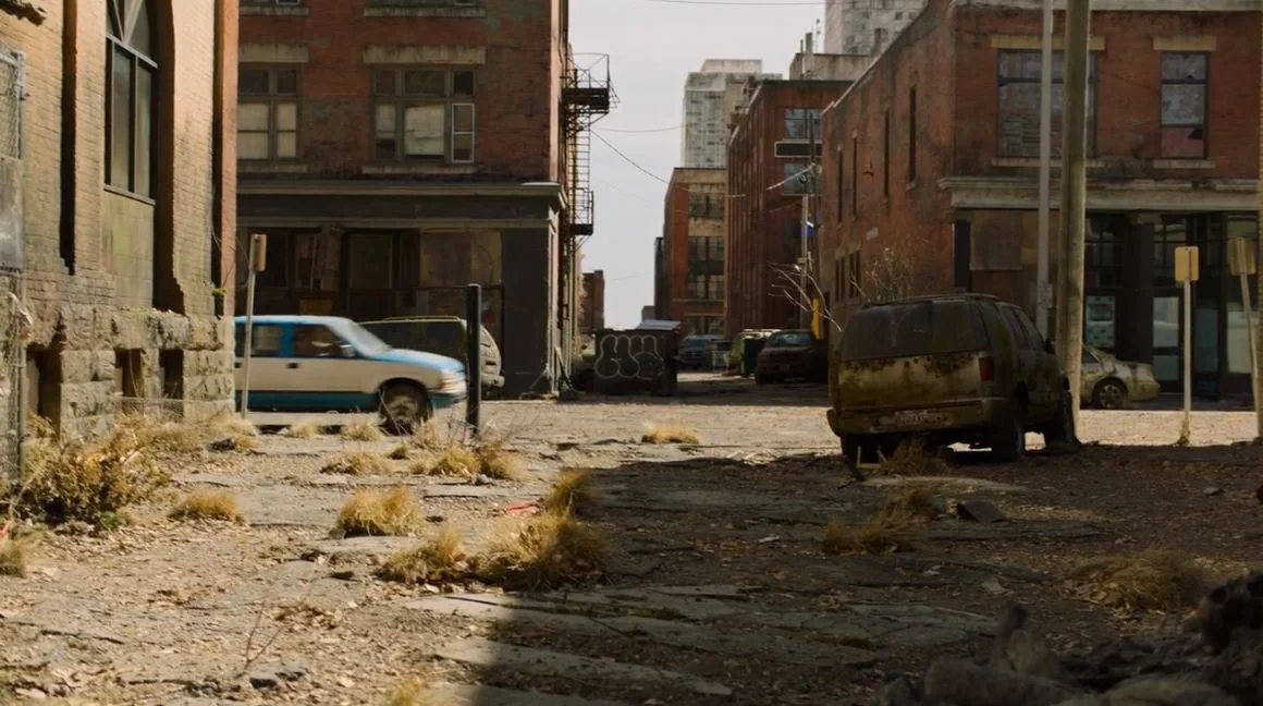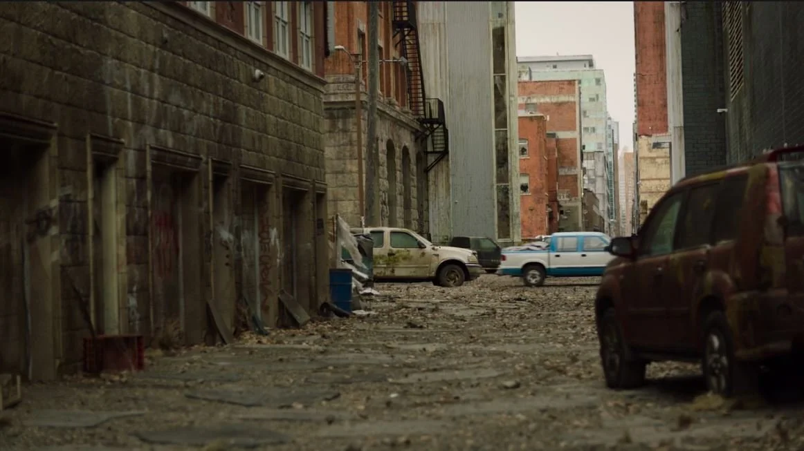 View of the alleyway with visible shots of the Tudhope Anderson Company Ltd., the Bell Block, the Louise Block, and Massey-Harris Co. Warehouse. The Last of Us, HBO.