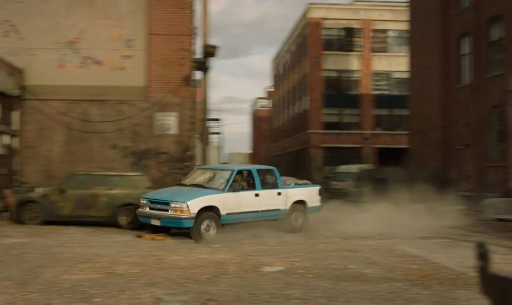 Joel’s truck in the alleyway about to crash into the built set between 11 Avenue and 10 Avenue SE. The Last of Us, HBO.